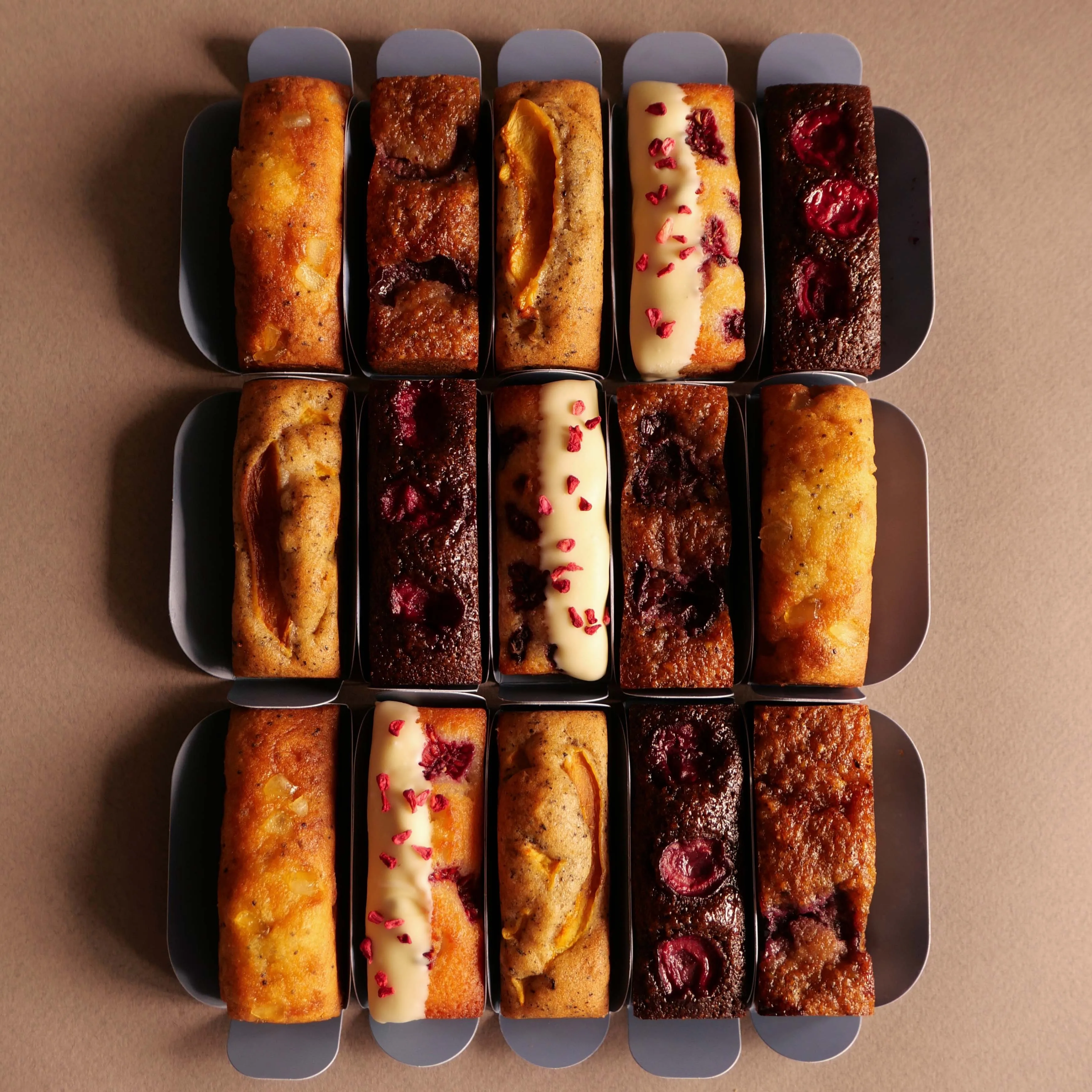 ассорти из 5 кейков. Кейк малиновый в белом шоколаде: шоколад белый 25,9% (сахар, масло какао, молоко сухое, эмульгатор соевый лецитин,ароматизатор натуральный ваниль), пудра сахарная, белок яичный, масло сливочное 82,5%, мука миндальная, малина, мука пшеничная в/с, малина сублимированная. Кейк фисташковый с черешней: черешня, белок яичный, пудра сахарная, фисташка очищенная, масло сливочное 82,5%, мука пшеничная в/с, крахмал кукурузный, разрыхлитель, соль. Кейк шоколадный с вишней: пудра сахарная, масло сливочное 82,5%, белок яичный, вишня, мука миндальная, мука пшеничная в/с, какао-пудра, соль. Кейк лимонный с маком: сахар белый, мука пшеничная в/с, желток яичный, сметана 30%, масло сливочное 82,5%, лимон, цукаты лимонные, мак, масло подсолнечное, разрыхлитель. Кейк со сливой и чаем эрл грей: слива, масло сливочное 82,5%, яйцо куриное, мука пшеничная в/с, сахар белый, разрыхлитель, чай эрл грей