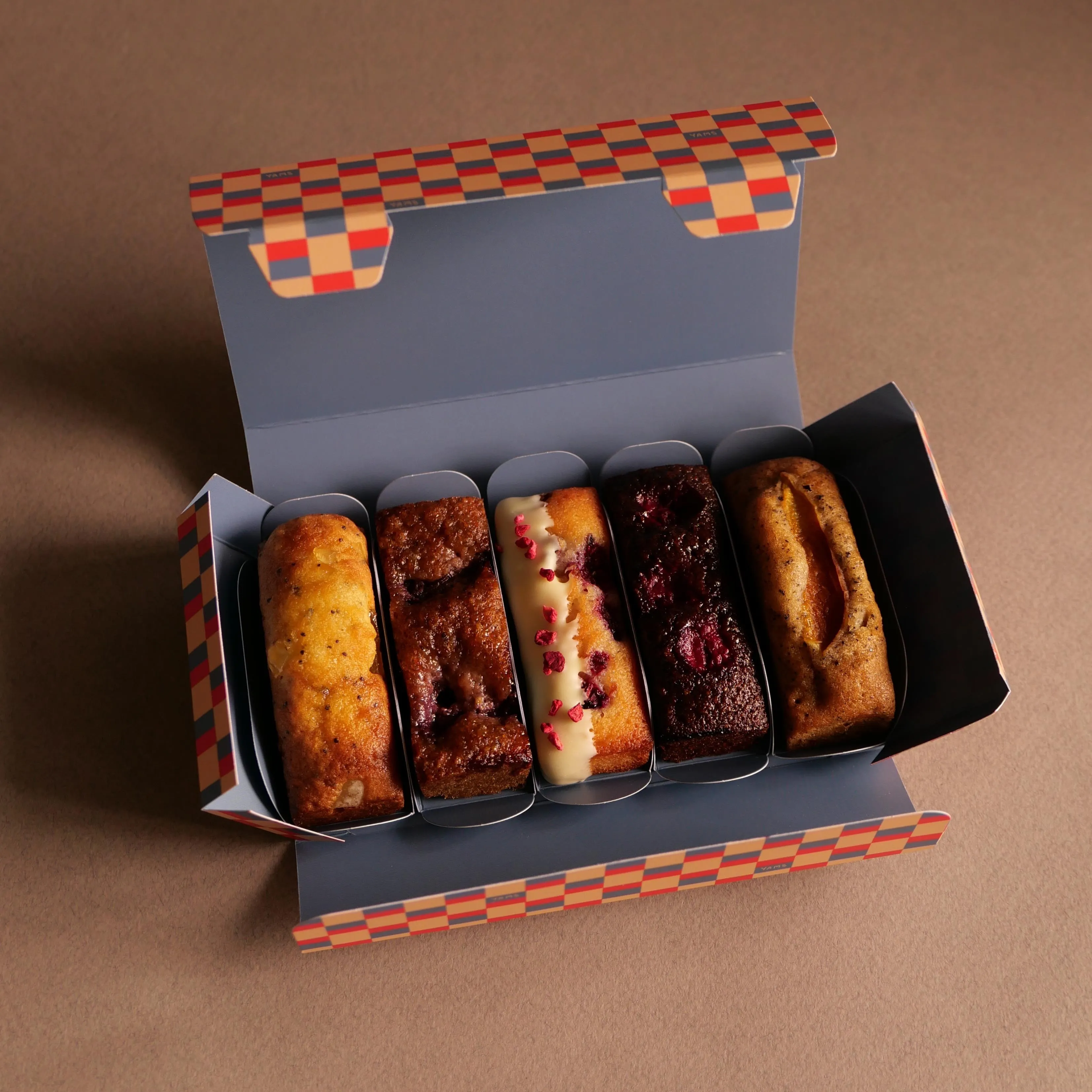 Кейки собраны в коробочку, где каждый из них помещен на индивидуальную подложку.