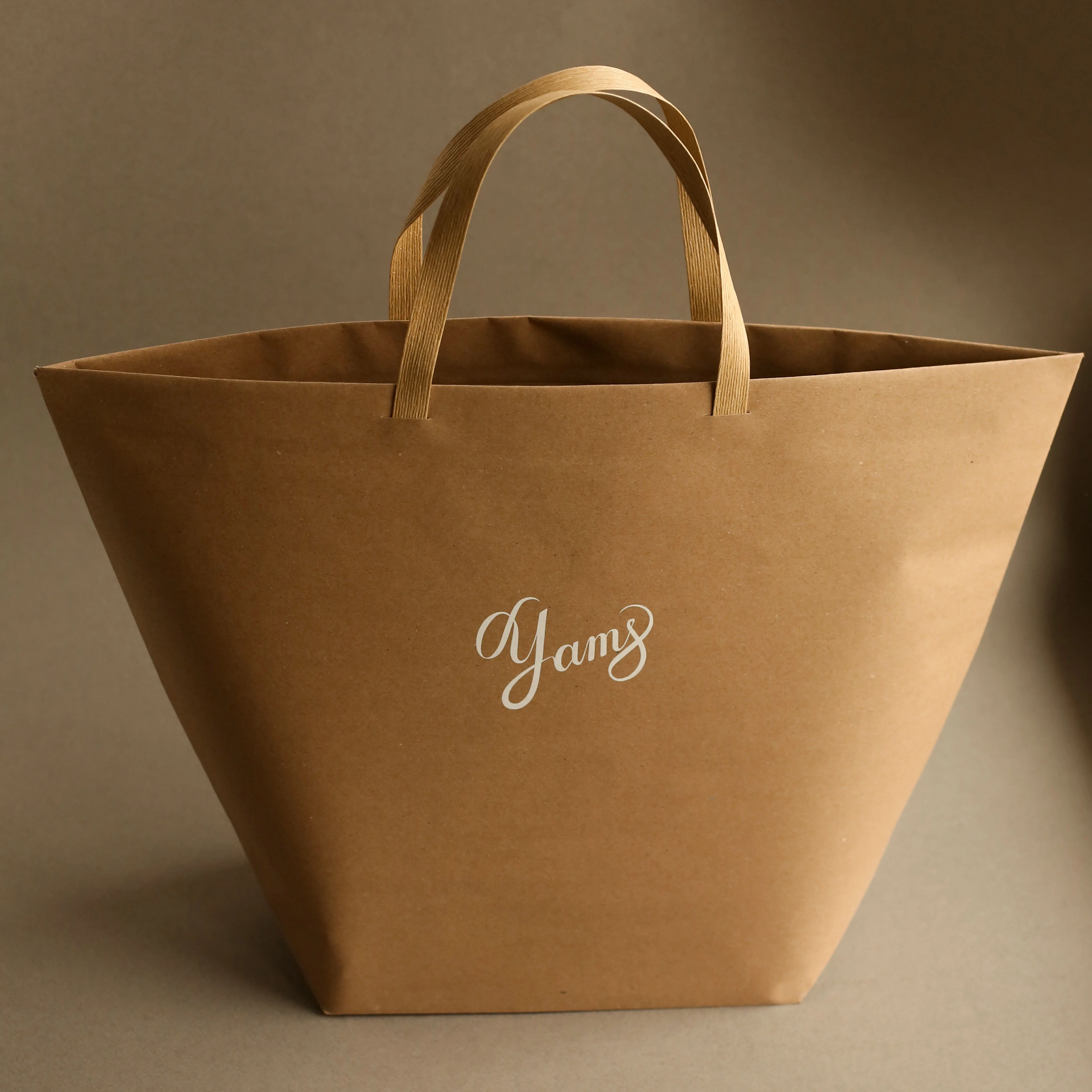 Сумка экслюзивного дизайна необычной трапециевидной формы, выполнена из плотной крафтовой бумаги, ручки сделаны из переработанной cпрессованной бумаги.
